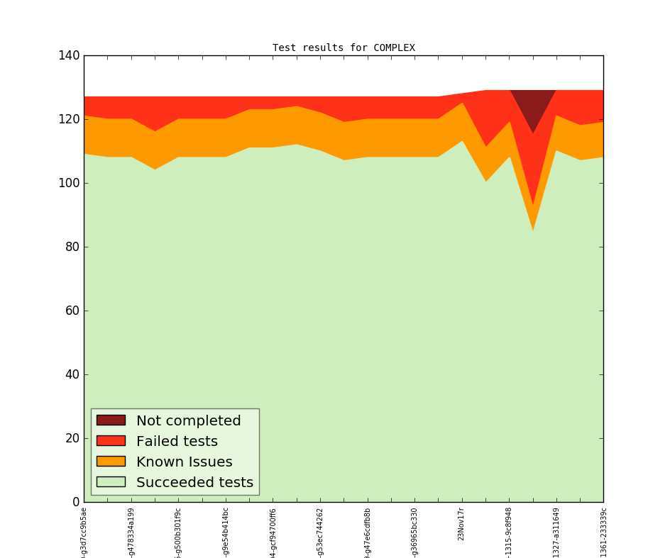 | Summary | 122 tests: 104 succeeded 12 known bugs 6 FAILED | 122 tests: 103 succeeded 12 known bugs 7 FAILED | 122 tests: 103 succeeded 12 known bugs 7 FAILED | 122 tests: 99 succeeded 12 known bugs 11 FAILED | 122 tests: 103 succeeded 12 known bugs 7 FAILED | 122 tests: 103 succeeded 12 known bugs 7 FAILED | 122 tests: 103 succeeded 12 known bugs 7 FAILED | 122 tests: 106 succeeded 12 known bugs 4 FAILED | 122 tests: 106 succeeded 12 known bugs 4 FAILED | 122 tests: 107 succeeded 12 known bugs 3 FAILED | 122 tests: 105 succeeded 12 known bugs 5 FAILED | 122 tests: 102 succeeded 12 known bugs 8 FAILED | 122 tests: 103 succeeded 12 known bugs 7 FAILED | 122 tests: 103 succeeded 12 known bugs 7 FAILED | 122 tests: 103 succeeded 12 known bugs 7 FAILED | 122 tests: 103 succeeded 12 known bugs 7 FAILED | 123 tests: 108 succeeded 12 known bugs 3 FAILED | 124 tests: 96 succeeded 17 FAILED 11 known bugs | 124 tests: 104 succeeded 11 known bugs 9 FAILED | 124 tests: 79 succeeded 23 FAILED 14 killed 8 known bugs | 124 tests: 105 succeeded 11 known bugs 8 FAILED | 124 tests: 102 succeeded 11 known bugs 11 FAILED | 124 tests: 103 succeeded 11 known bugs 10 FAILED |
