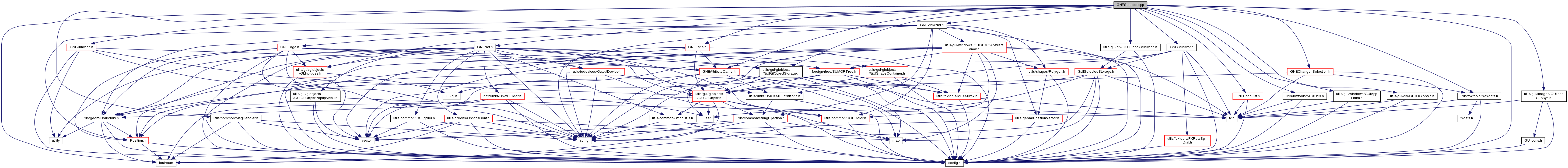 #include <config.h>#include <iostream>#include <utils/foxtools/fxexdefs.h>#include <utils/foxtools/MFXUtils.h>#include <utils/common/MsgHandler.h>#include <utils/gui/windows/GUIAppEnum.h>#include <utils/gui/div/GUIIOGlobals.h>#include <utils/gui/div/GUIGlobalSelection.h>#include <utils/gui/globjects/GUIGlObjectStorage.h>#include <utils/gui/images/GUIIconSubSys.h>#include "GNESelector.h"#include "GNEViewNet.h"#include "GNENet.h"#include "GNEJunction.h"#include "GNEEdge.h"#include "GNELane.h"#include "GNEUndoList.h"#include "GNEChange_Selection.h"#include "GNEAttributeCarrier.h"