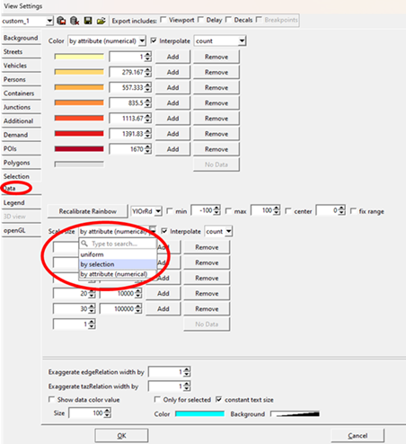 TAZ relation lines can also be displayed with varying widths according to demand. Like above mentioned, firstly, you click "Data" in the window shown after selecting Edit->Edit Visualisation or after clicking the color palette icon "View Settings". Then choose "by attribute (numericval)" in the drop-down window of "Scale size" and adjust the wished scale size for each demand category. This setting can be used together with the setting to display the TAZ polygons by different colors (see above). The buttons/rubrics you need to click are illustrated below.